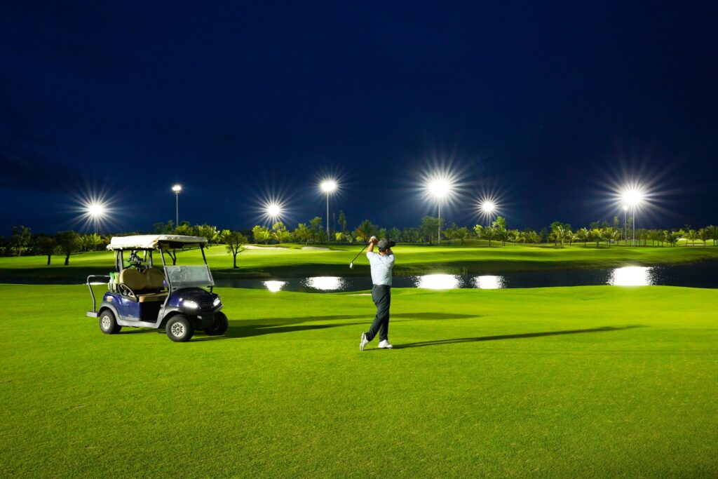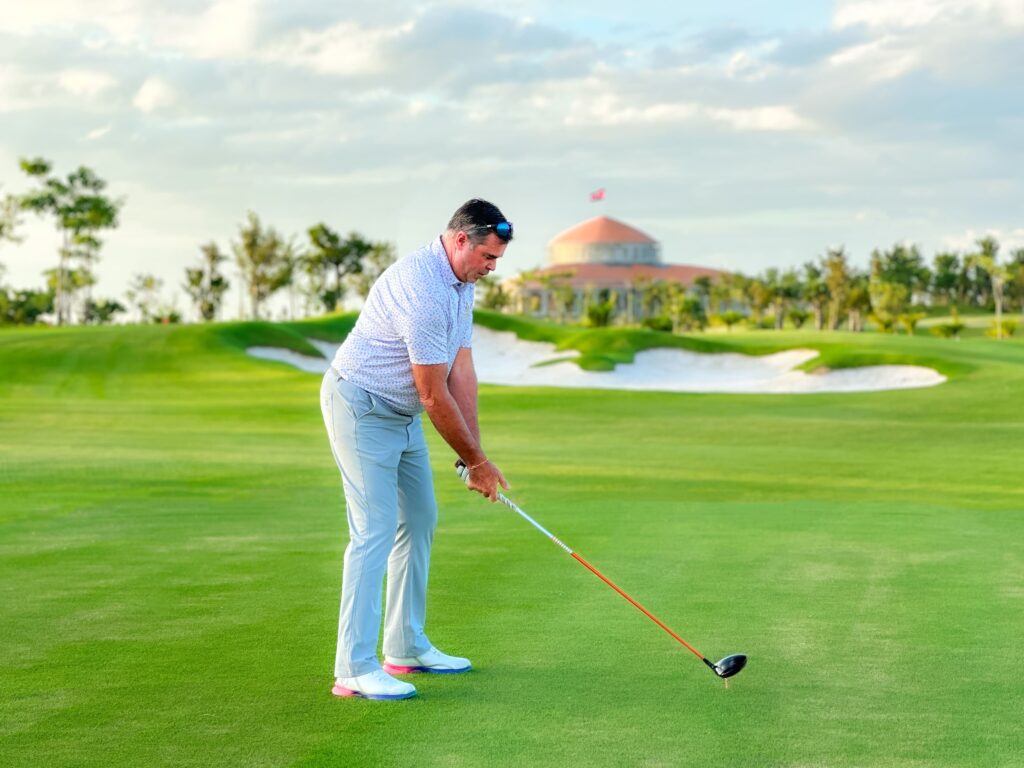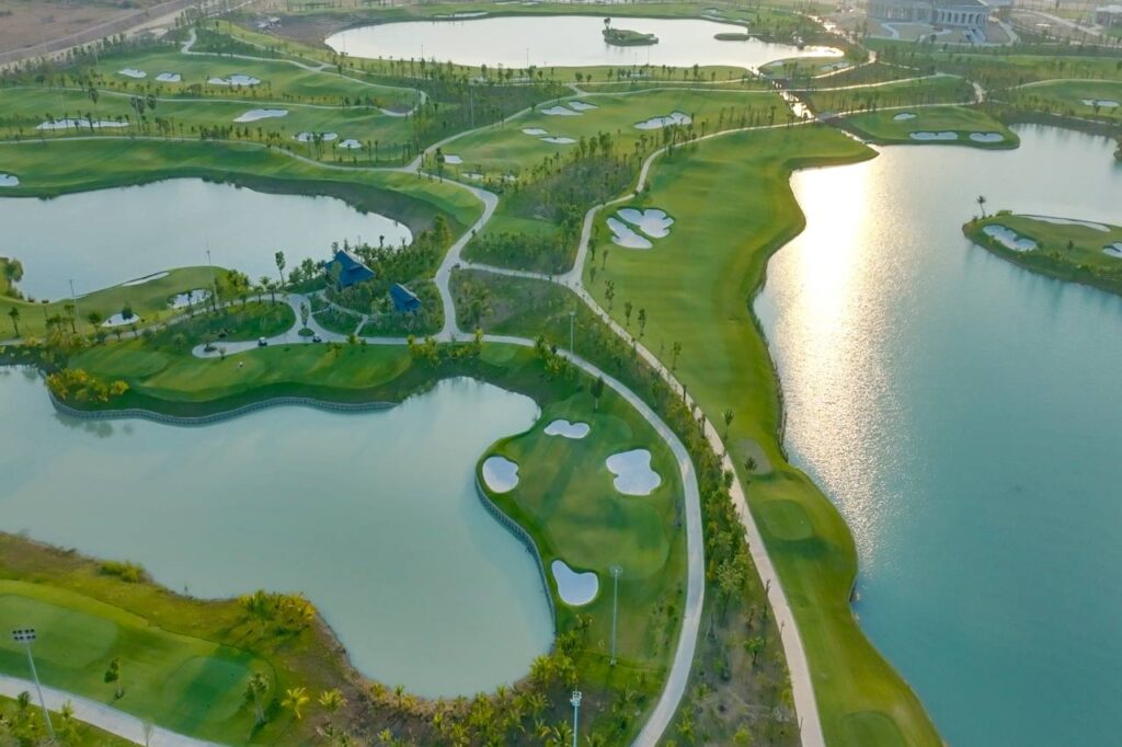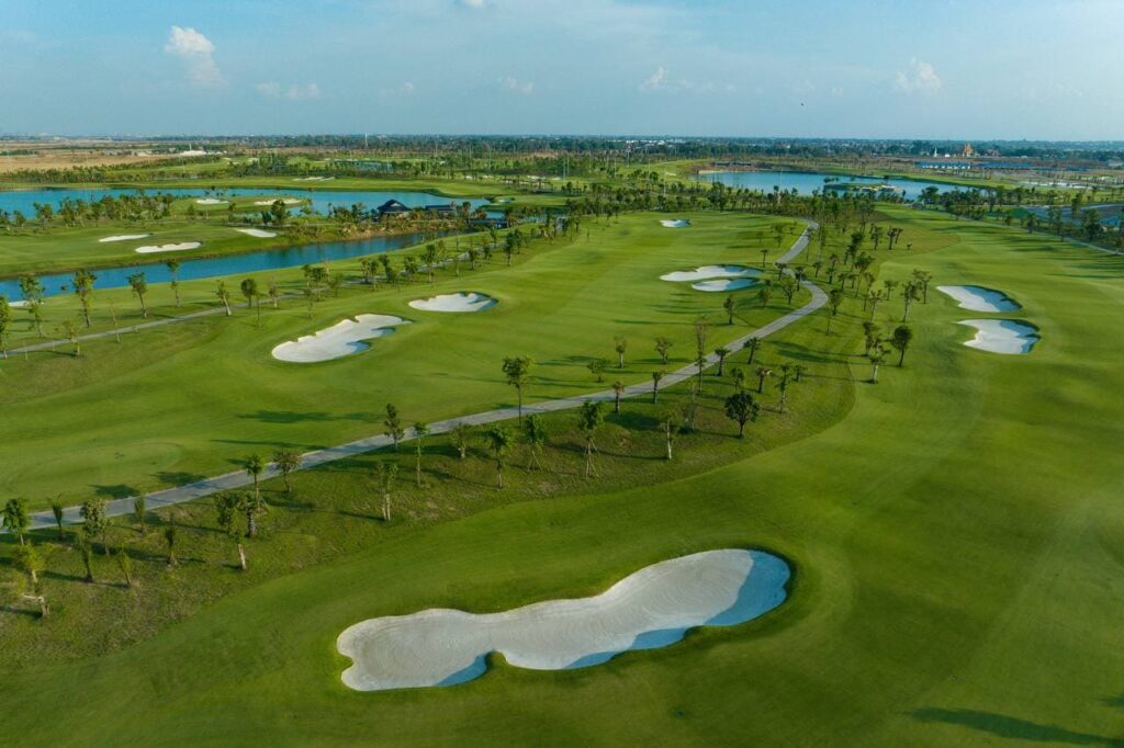 Il y a plusieurs choses : c’est un design par Brian Curley, il a à son actif 150 parcours, dont Mission Hills en Chine, avec douze parcours à Shenzhen, un 19e trou en forme de carte du Cambodge, accessible en bateau pour aller putter, et des graminées uniques. Zeon Zoysia pour les fairways, Primo Zoysia pour les greens du Lake Course, Lyngz Zoysia pour les greens du Palm Course -une première en Asie, un drainage ultra-performant. On roule sur les fairways même en saison des pluies, avec un GPS dans tous les golf carts, ou un driving range de 350 m sur deux étages avec des distributeurs automatiques de balles. L’objectif : en faire l’un des meilleurs resorts d’Asie.