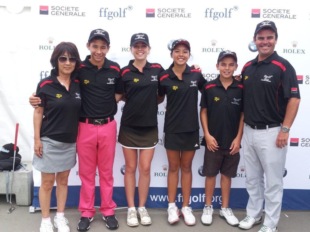 Championnat de France en 2014 à Guyancourt, sur le Golf National (Anthony Cuer, Mathilde Guépy, Ariane Klotz et Tess Hillaireau).